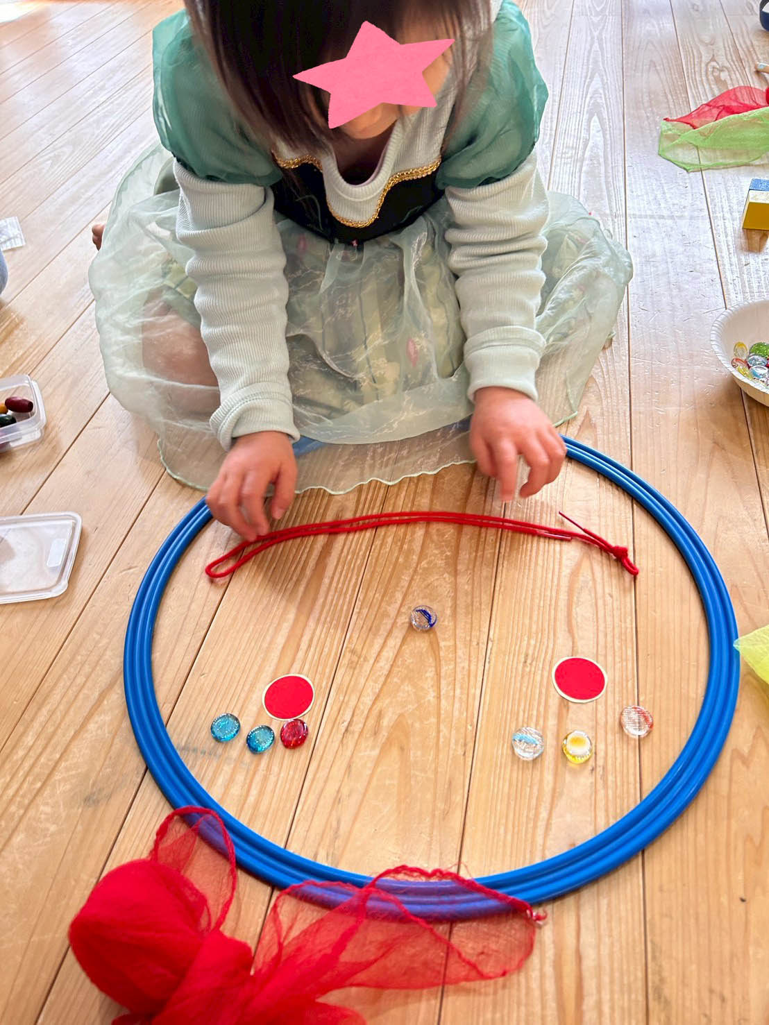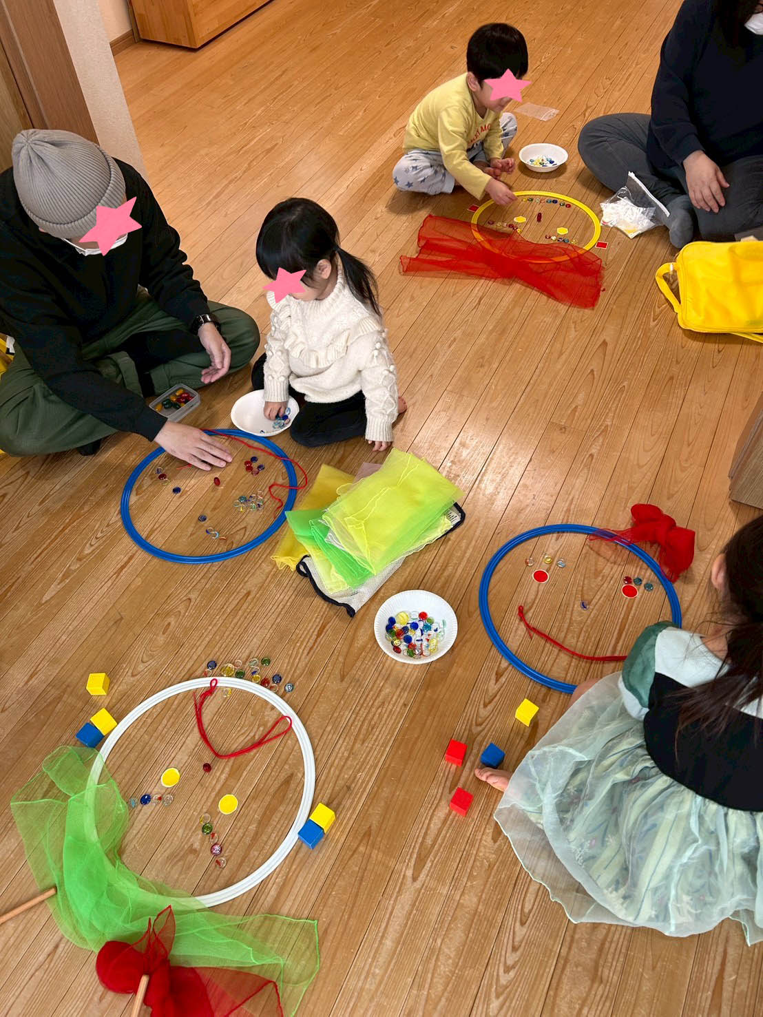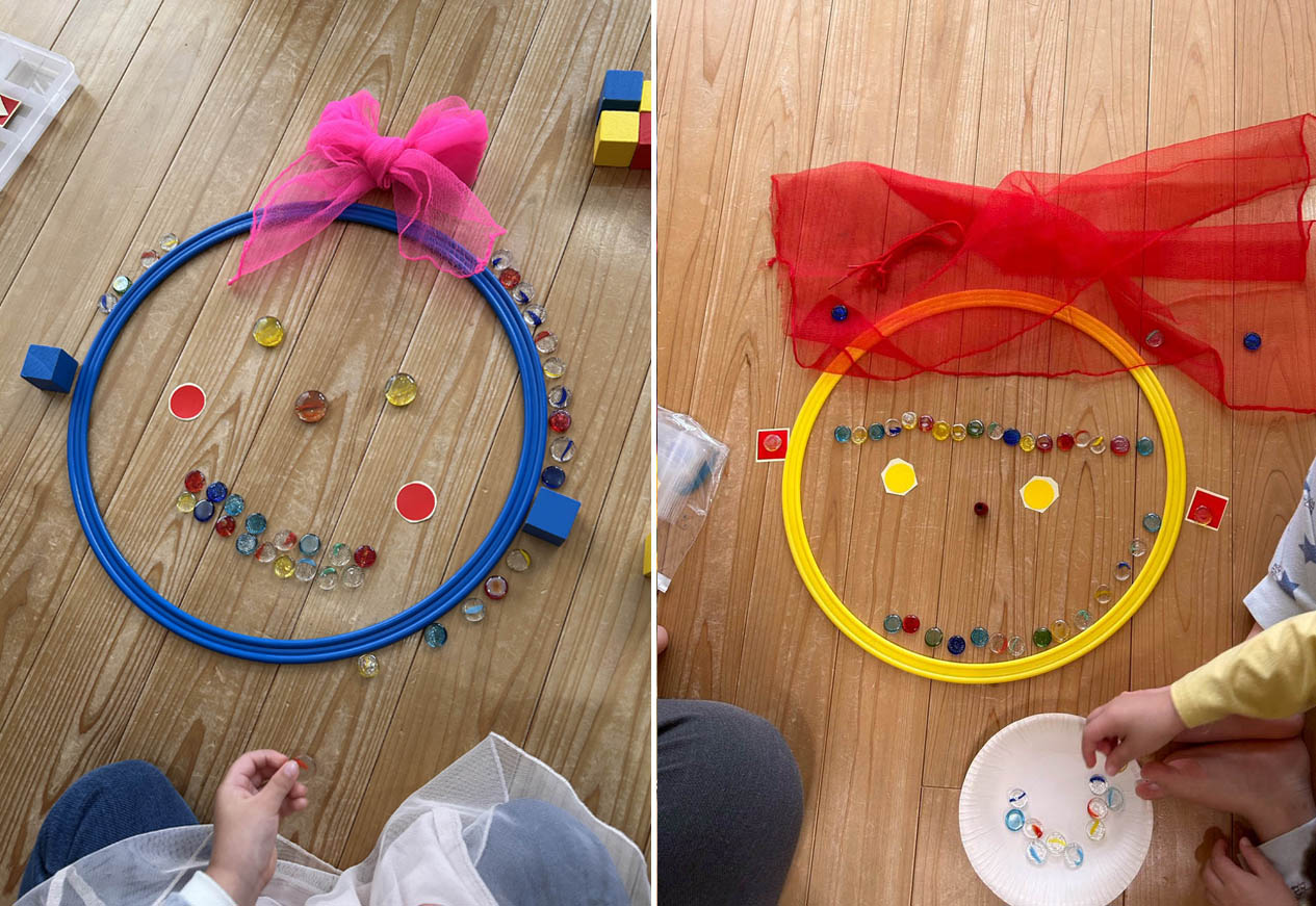 リトミックの教具を使用して、思い思いの顔を保護者の方と一緒に作りました。